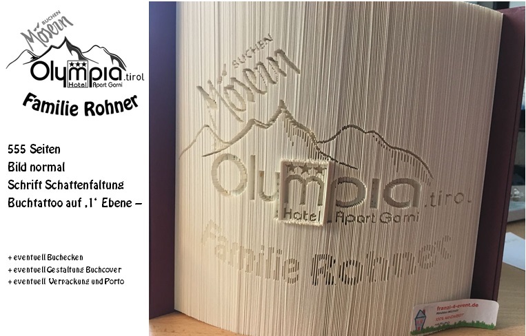 Die angegebene Seitenzahl bei den jeweiligen Motiven bezieht sich generell nur auf das Motiv oder den Schriftzug. Da die Bücher unterschiedliche Seitenzahlen haben, können die tatsächlich gefalteten Seiten im Buch höher sein. Bitte beachten Sie, dass ich die Auswahl der Seitenzahl dem Faltobjekt anpassen muss. Der Zeitaufwand beträgt bei vielfach geschnittenen Modellen wesentlich mehr (bis zu 20 Stunden) und wird individuell festgesetzt. Einige Motive haben vielleicht eine geringere Seitenzahl, der Arbeitsaufwand ist aber wesentlich komplexer, weshalb die Preisbildung zur Seitenzahl sehr unterschiedlich sein kann. Auch eine größere oder kleinere, geschwungene oder gerade Schrift bilden sehr unterschiedliche Preisgefüge. Geschnittene Motive mit Gesichtern sind sehr aufwändig, weshalb hier die Preise auch höher sind.